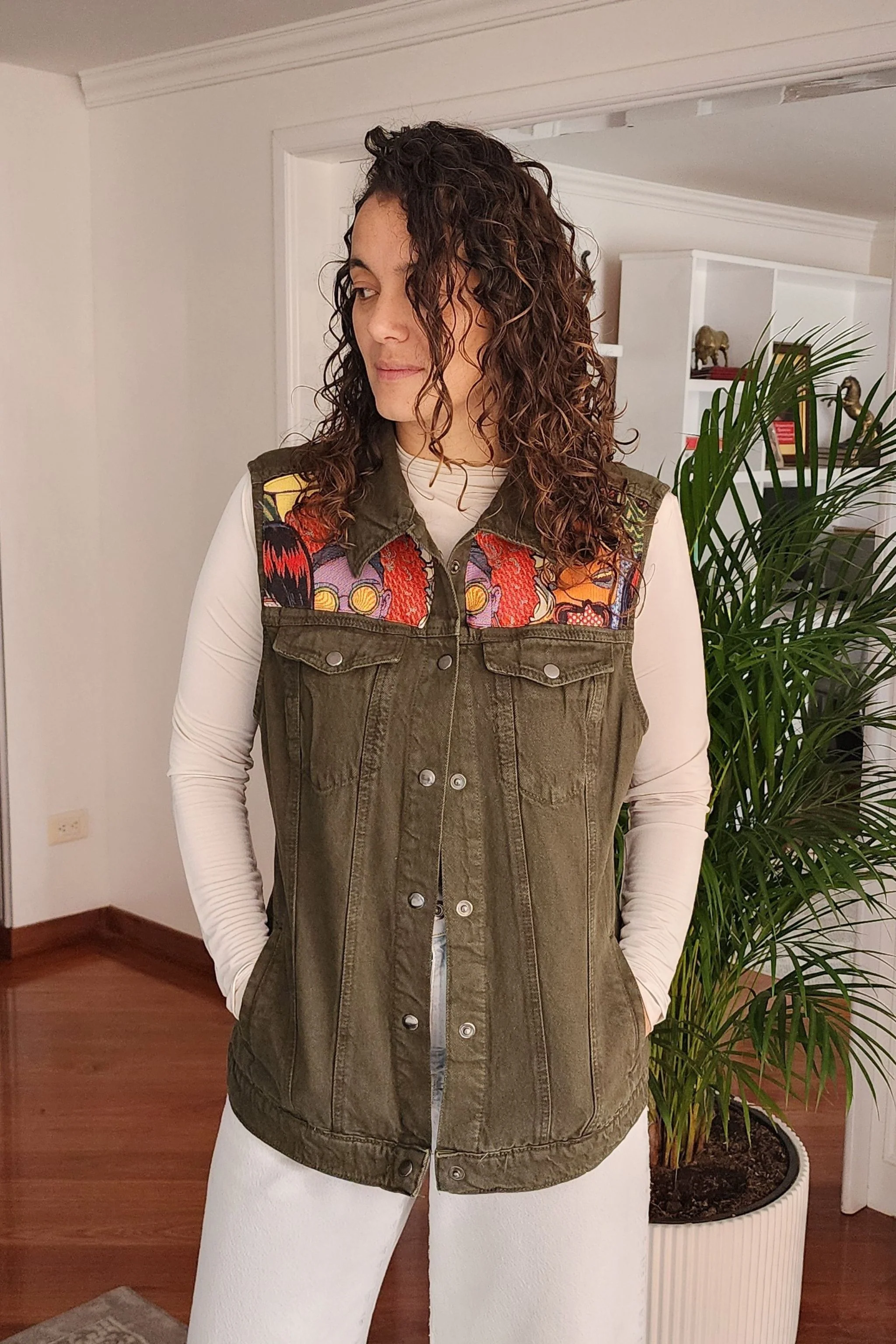 El chaleco denim Iconic Pop es una pieza vibrante y llena de personalidad, perfecta para quienes buscan un estilo único.