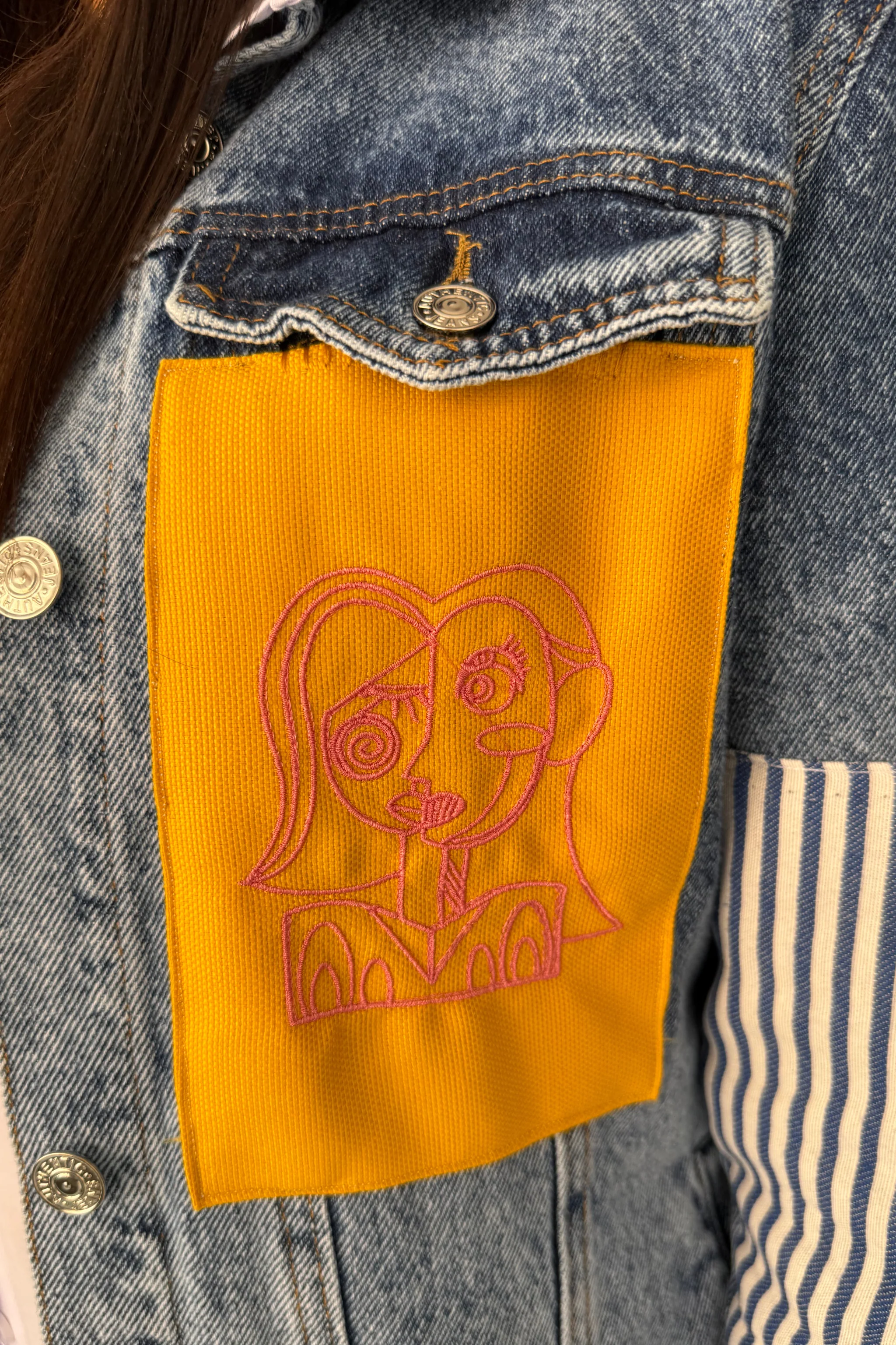 En parte frontal cuenta con diferentes parches tejidos y bordados de caras abstractas pegadas a mano.