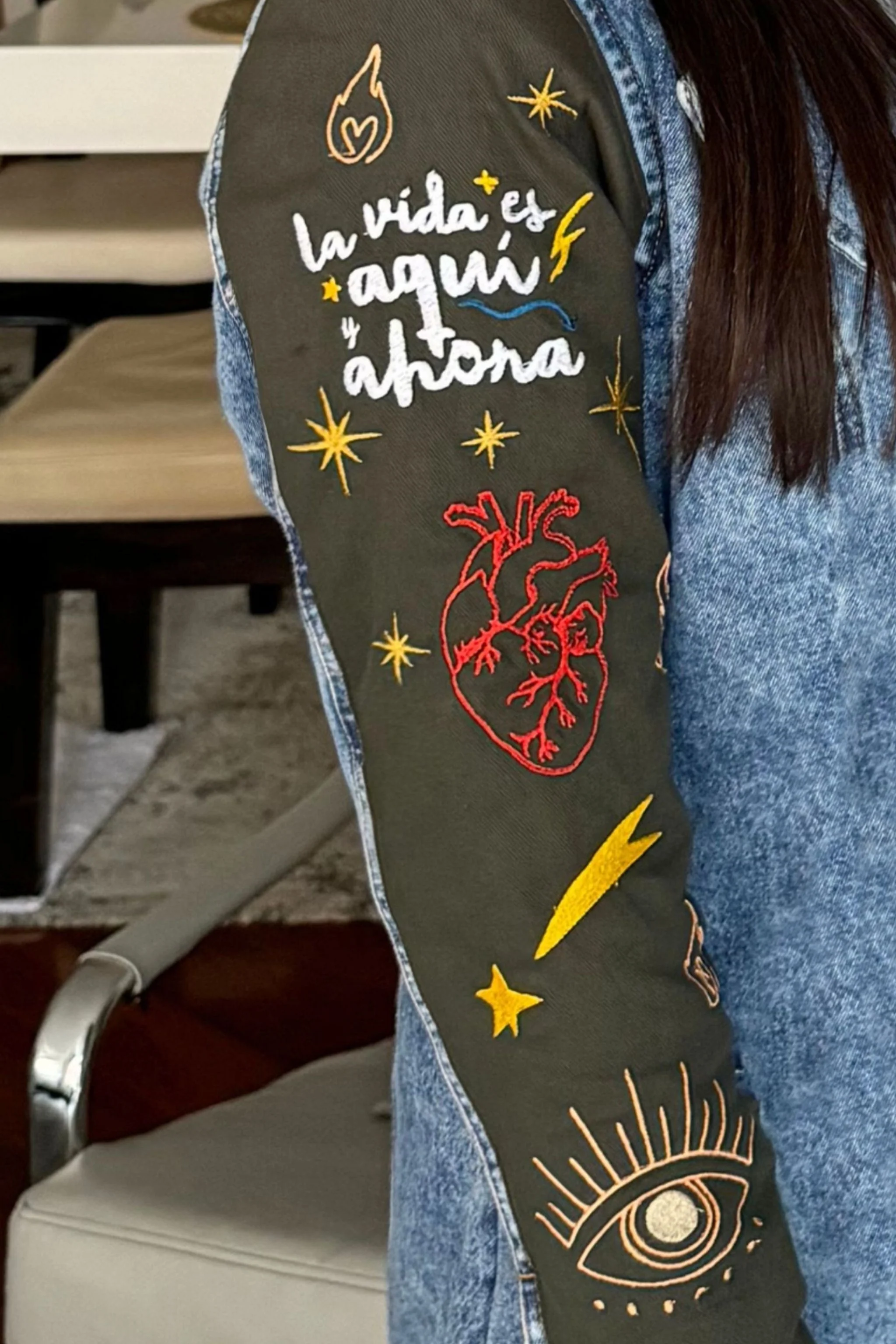 Chaqueta CLÁSICA hecha en denim de alta calidad, combinada con Bordados que empoderan a vivir el presente y estrellas bordadas alrededor de la chaqueta, diseños exclusivos!