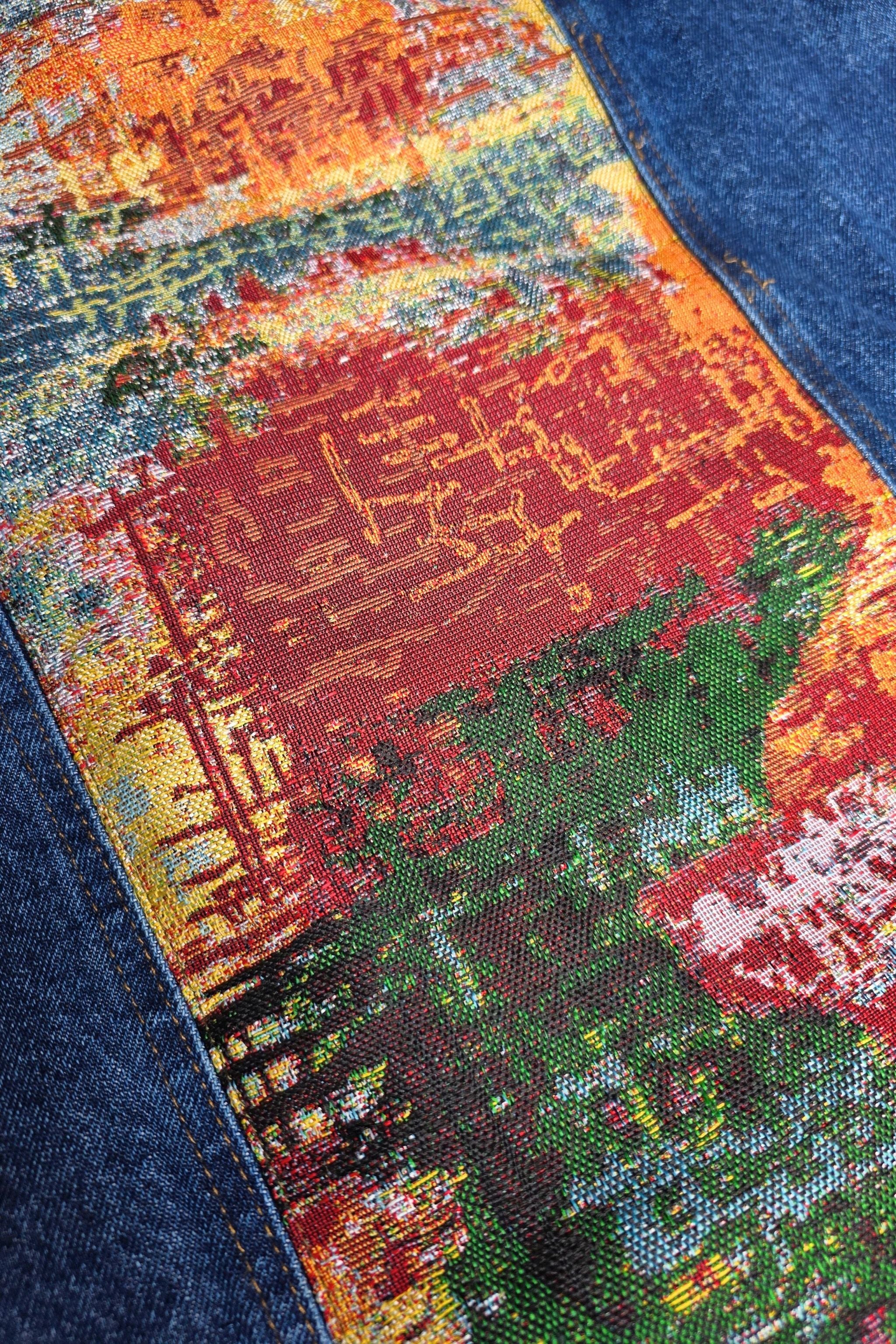 Chaqueta CLÁSICA HOMBRE hecha en denim de alta calidad, combinada con una tela tejida en Colombia con motivo TRAZOS, diseños exclusivos!