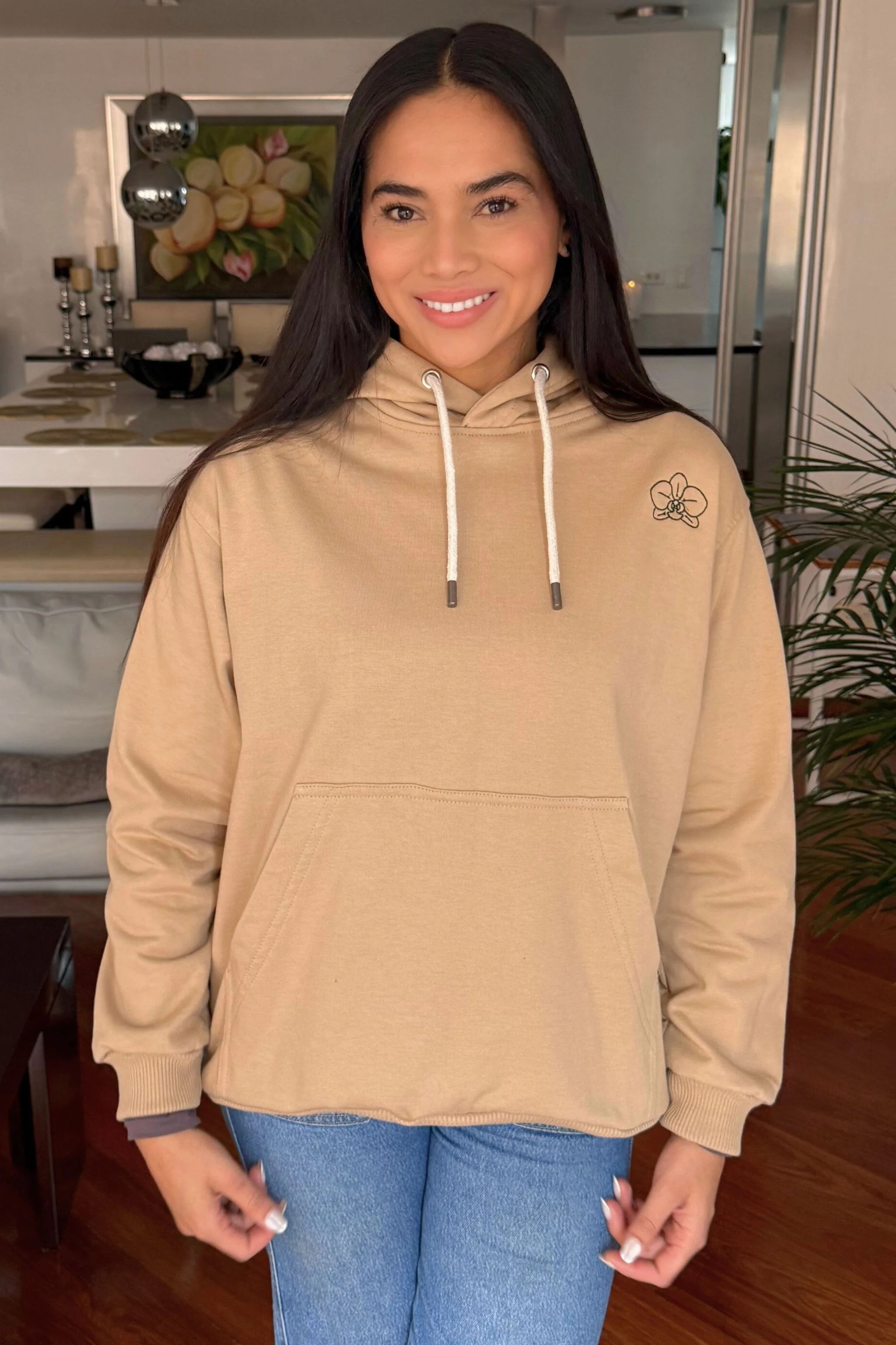Hoodie color caqui, elaborado en tela 100% algodón de alto gramaje (400g), intervenido con bordado de paisaje playero en la parte trasera y el logo al frente de una orquidea.